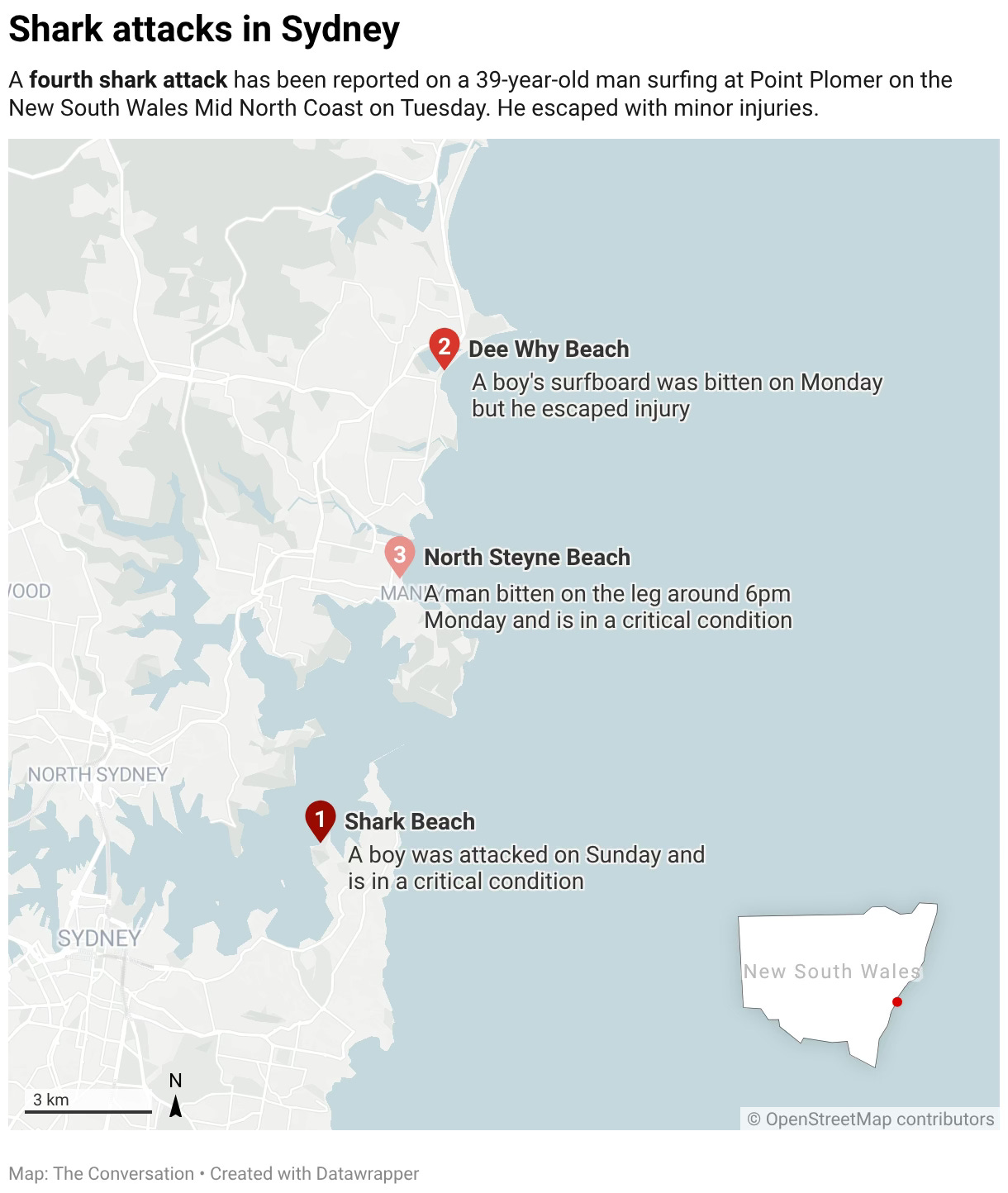 Only a few hours earlier, a shark knocked an 11-year-old boy into the water at Dee Why – just north of Manly – and bit a chunk out of his surfboard. And on Sunday afternoon, a 12-year-old boy was bitten by what authorities believe was a bull shark while swimming at a popular beach in Sydney Harbour. He is still in a critical condition in hospital.