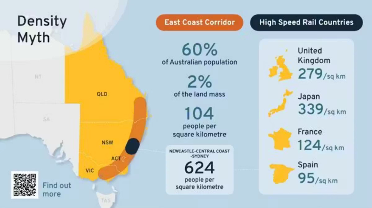 As the High Speed Rail Authority’s business case shows, the Newcastle, Central Coast and Sydney corridor is the mostly densely populated part of Australia, with 624 people per square kilometre.