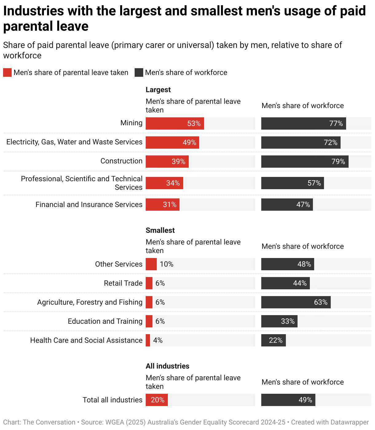 Among the industries with the biggest gaps between men’s share of the workforce and share of parental leave, men in transport, postal and warehousing take 24% of paid parental leave, despite making up 73% of the workforce.